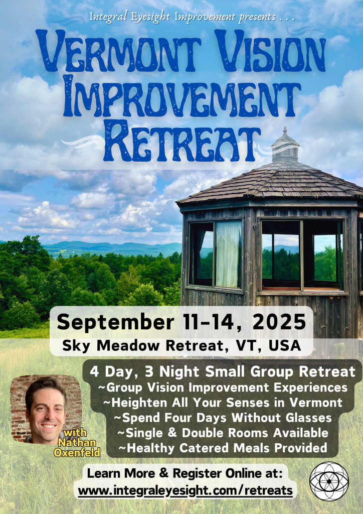 Come visit the gorgeous Green Mountains of Vermont and immerse yourself in Natural Vision Improvement for four days under the guidance of Nathan Oxenfeld and with a small group of others.